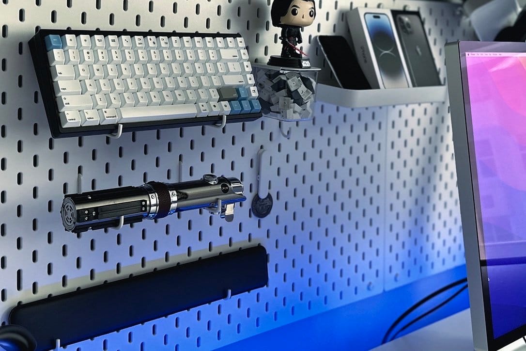 Behind my desk, I have an Ikea Skadis accent to display a few knick-knacks. This is where I also display my Mechanical Keyboard when not in use. The keycaps are a custom set I designed because I couldn't find good keycap sets with proper Mac modifiers. You can also spot a Legacy Lightsaber, a palm rest from Logitech, a Kylo Ren Funko pop, a spare iPhone X, and a few iPhone boxes.
